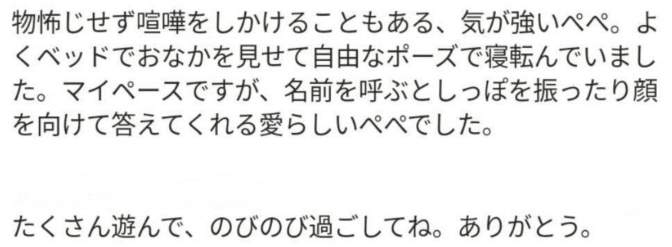 気が強くて、おもちゃ遊びが好きで、お散歩も大好きだったぺぺさん、天国でも楽しく遊んでね。